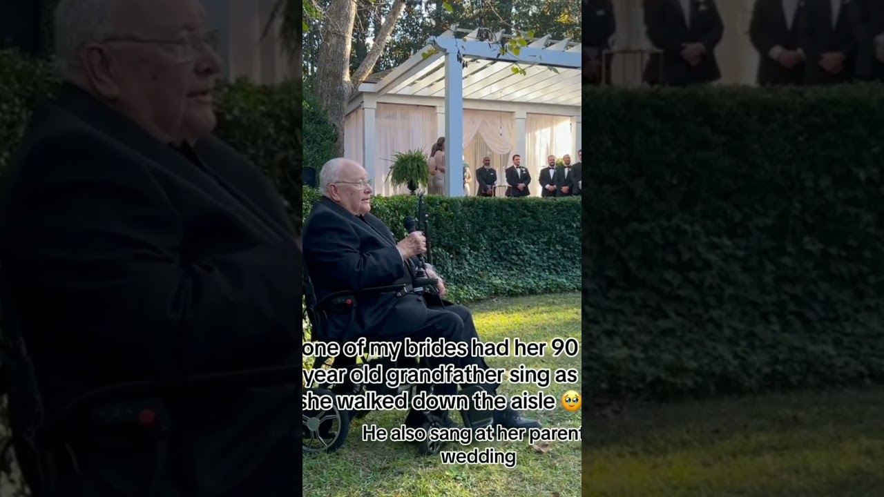 In a heartwarming scene captured on video, a 90-year-old grandfather stole the show at his granddaughter’s wedding. As the bride made her way down the aisle, her grandfather, seated in a wheelchair, delivered a beautiful rendition of Elvis Presley’s “Can’t Help Falling in Love.” As this grandfather sings at her wedding, his deep, resonant voice perfectly matched the iconic song, filling the venue with emotion and love.