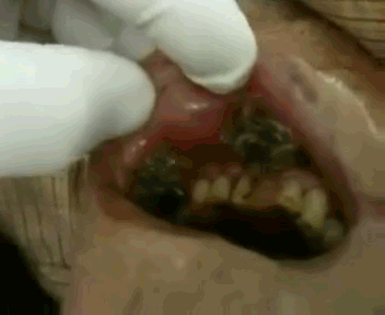 Oral myiasis is basically mouth maggots. It is primarily a disease of tropical areas and infects the homeless and/or mentally challenged. I plan to add more images and videos as I come across them.