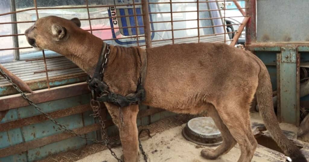 Mufasa, a majestic mountain lion, endured a life of torment within the confines of a traveling circus in Peru. Chained to the back of a pickup truck, he was subjected to unimaginable cruelty, all in the name of entertainment and profit. For 20 long years, he languished in these deplorable conditions, a life he neither chose nor deserved.