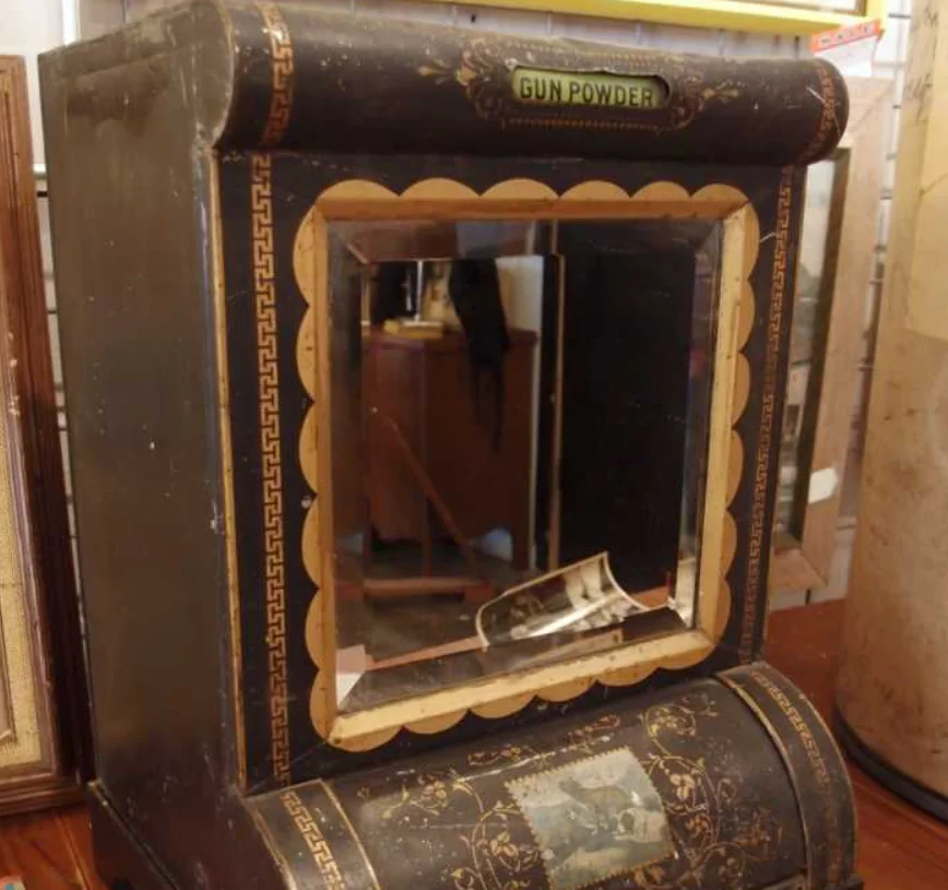 This elegant box is actually a Victorian shop dispenser. It was designed for selling goods in bulk and came in various sizes. In this particular one, it had a label insert for gunpowder, but it could have been used for sugar, candy, or other bulk commodities as well. The glass front allowed customers to see the quality of the goods they were purchasing. And why the picture of hunting dogs? Well, it’s just a decorative touch because the intention was to store gunpowder only. Quite an interesting piece, isn’t it?