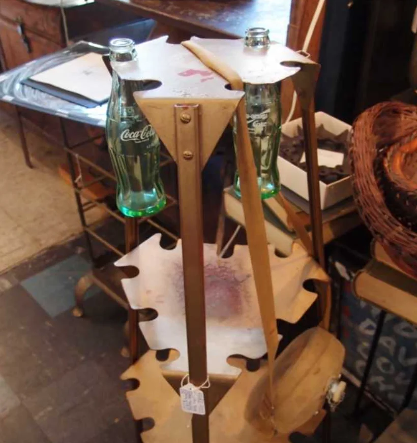 This stand was designed as a display for soda bottles, but not just any soda. It was specifically created by Nehi for their soda bottles as part of their marketing strategies. The triangular shape and notches were perfect for holding the bottles with their convenient necks. Back in the days of the Depression, you could find these stands in corner shops and grocery stores. They were quite a sight!