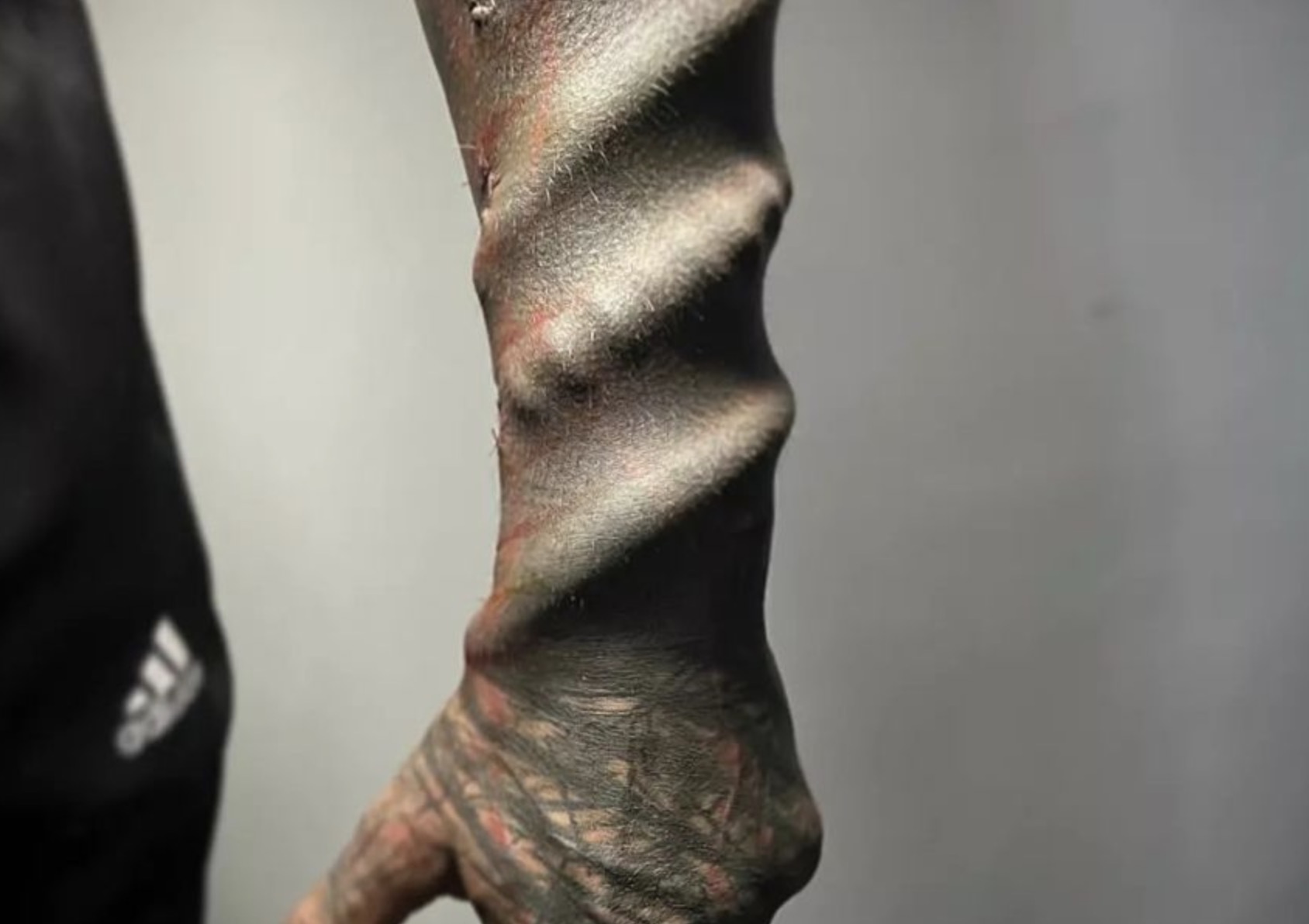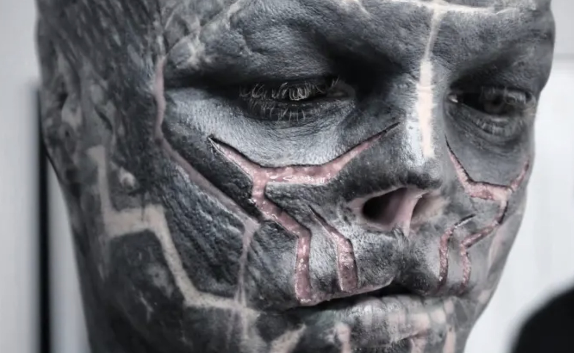 Dermal implants give his face a textured appearance and sculpted lines around his cheekbones, enhancing his facial characteristics even further.