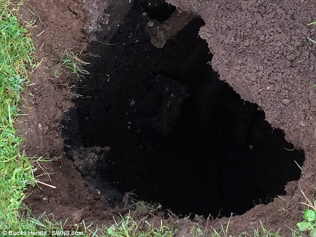 While Emma James was mowing the grass in front of the house with a lawnmower, she discovered a hole in the ground. As the day went on, the pit grew bigger and bigger until it reached a depth of 2 meters. What was even stranger was the fact that there were some rusty STEPS inside!