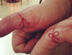 After a bit of research, I discovered that the red string tattoo is known as the ‘red string of fate’ in Asian cultures. Typically found on a man’s thumb and a woman’s pinky finger, it resembles a simple bow with tails, akin to a tied shoelace.