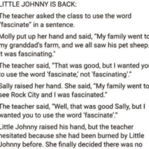 LITTLE JOHNNY IS BACK: The teacher asked the class to use the word “fascinate” in a sentence. Molly put up her hand and said, “My family went to my granddad’s farm, and we all saw his pet sheep. It was fascinating. “The teacher said, “That was good, but I wanted you to use the word ‘fascinate,’ not ‘fascinating”.”