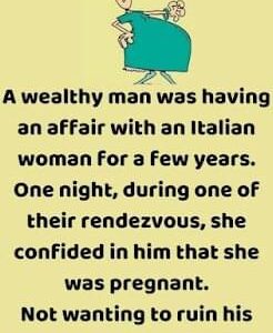 A wealthy man was having an affair with an Italian woman for a few years.One night, during one of their rendezvous, she confided in him that she was pregnant. Not wanting to ruin his reputation or his marriage, he paid her a large sum of money if she would go to Italy to have the child.