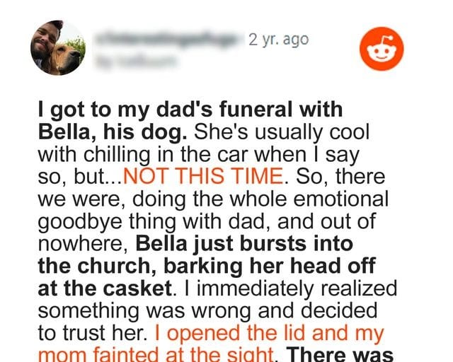 As Jack approached the casket to pay his respects, Bella’s behavior suddenly took an unexpected turn. Instead of remaining calm as usual, she began to bark incessantly, her fur bristling with agitation. Jack’s heart raced with apprehension as he realized that something was amiss.