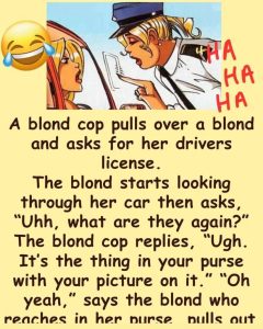 A blonde cop pulls over a blonde driver and asks for her driver’s license. The driver searches through her car and asks, “Uhh, what are they again?” The cop responds, “Ugh. It’s the thing in your purse with your picture on it.”