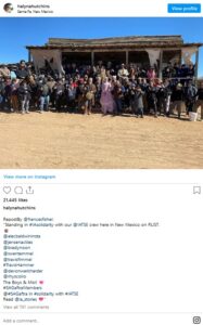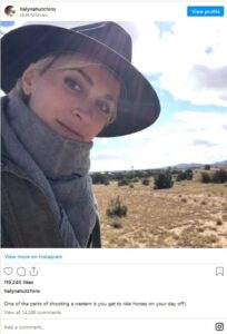 “One of the perks of shooting a western is you get to ride horses on your day off,” she wrote in a caption accompanying a video of her riding a horse on the “Rust” set, located just outside of Santa Fe.