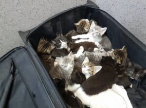 The suitcase was cut with several holes so that air could enter, allowing the miserable kittens to breathe. Whoever abandoned them must have wanted them to survive. The “luggage” was also purposefully dumped adjacent to a well-known animal refuge.