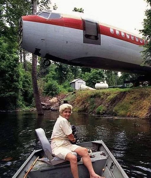 Ussery made use of the lake that was already present on her property by parking the plane such that the nose pointed out over the water. Because of this particular reason, a substantial amount of concrete was used to secure the tail. She then started demolishing the nearly 1,500 square foot interior.