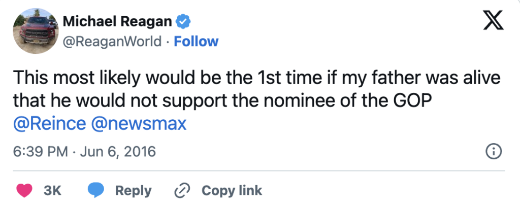 “FYI it is amazing that you all of a sudden support my father when for 8 yrs you treated him like you are treating Trump today,” he wrote in a post on X. “Give Trump time and get out of the way,” he added, noting: “Remember my dad ended up kicking your a**es.” Reagan’s sentiment is particularly surprising given his sharp criticism of Trump after he secured the GOP nomination in 2016. “This most likely would be the 1st time if my father was alive that he would not support the nominee of the GOP,” Reagan wrote at the time, tagging then-Republican National Committee Chair Reince Priebus.
