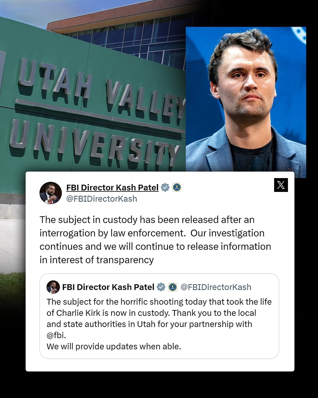 UPDATE: After previously stating that a person of interest was in custody in relation to the assassination of Charlie Kirk, FBI Director Kash Patel announced that the subject was “released after an interrogation by law enforcement.”